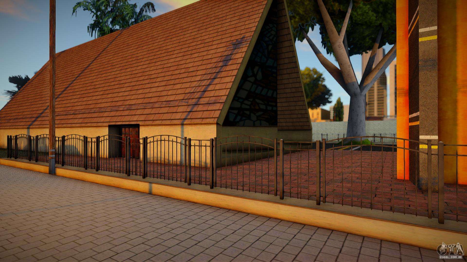 Mod de alta qualidade - cerca metálica HD 3D (atualizada) para GTA San Andreas. As texturas que faltam foram atualizadas. O mod substitui a cerca ao redor da igreja perto do local inicial por uma textura de alta resolução com efeito volumétrico (no original, era apenas uma textura com detecção de colisão).